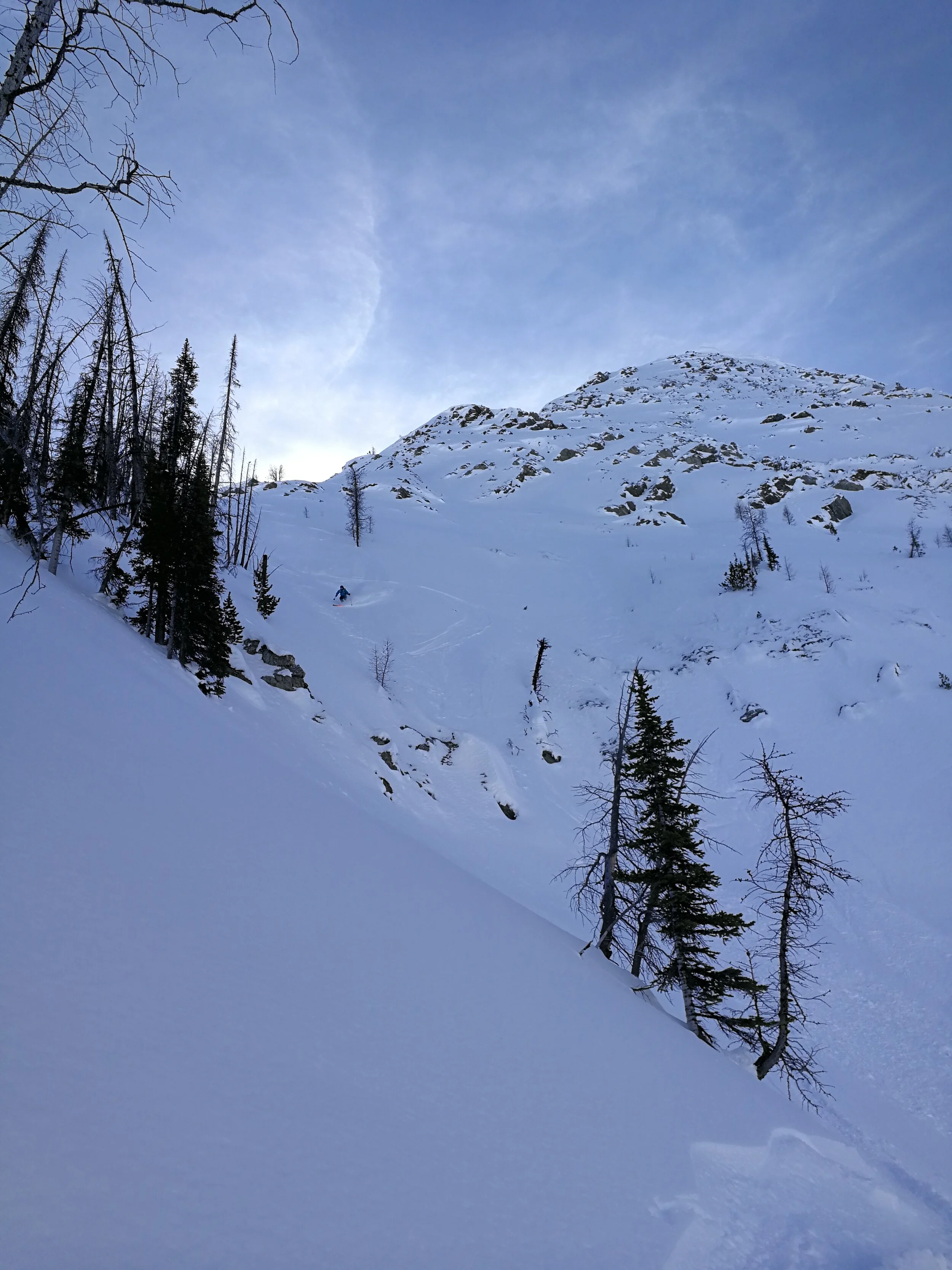 We imagined we could find some slightly north-facing terrain on the western slopes, so we threw skins on and humped up the burnt trees to gain the west-facing terrain.